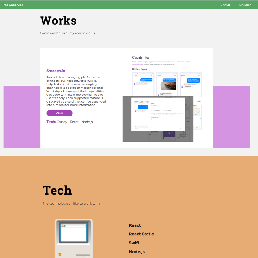 This portfolio was built with React Static with the goal of showcasing my most recent works. React Static generates a static website from a React app and markdown (in my case) or a headless CMS. The design was made on Sketch.