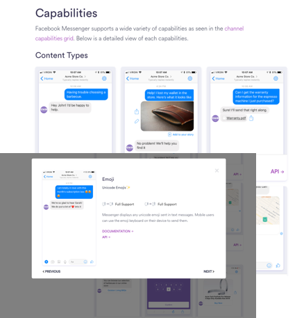 Smooch is a messaging platform that connects business sofwares (CRMs, helpdesks…) to the new messaging channels like Facebook Messenger and WhatsApp. I revamped their capabilities doc page to make it more dynamic and user friendly. Each supported feature is displayed as a card that can be expanded into a modal for more information.